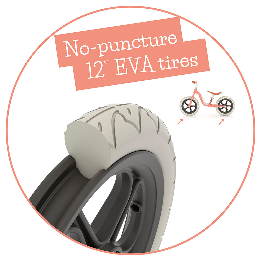 Непробивните 12-инчови гуми от EVA пяна освен сигурни са и изключително удобни: няма нужда от помпане = няма риск от спукване и смяна. От сега нататък само забавление!